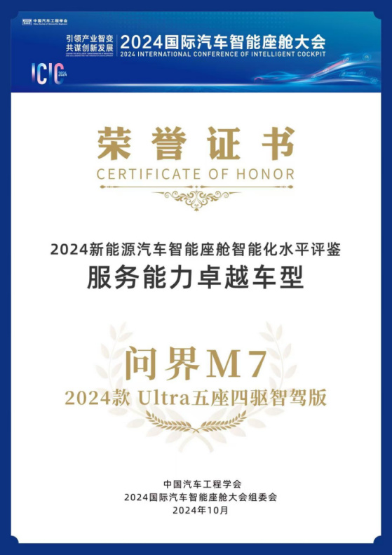 在科技飞速发展的时代,智能座舱成为汽车产业的又一核心话题。10月14日至16日,2024国际汽车智能座舱大会(ICIC2024)举行,以“引领产业智变,共谋创新发展”为主题,围绕智能座舱产业融合与生态创新、用户体验等内容展开研讨交流。在中国汽车工程学会主办的2024新能源汽车智能座舱智能化水平评鉴活动中,问界M7荣获“服务能力卓越车型”奖项,彰显了其在智能座舱领域的非凡实力与前瞻视野。