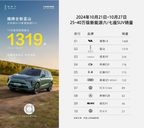 自上市以来,全新蓝山的销量持续攀升,根据最新销量数据,10月第四周(10.21-27)销售1319辆,环比增长15.9%,表现出稳健增长的态势。这一销量表现与理想L8相当,使其成为25-40万元级新能源六/七座SUV市场的唯二选择之一,这无疑也印证了全新蓝山的产品实力。全新蓝山正在成为了越来越多家庭用户的购车优选!