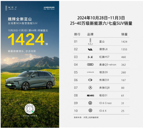 自全新蓝山问世以来,其凭借出色的性能和智能化优势,在竞争激烈的汽车市场中迅速崭露头角,赢得了消费者的广泛认可和好评。据最新周销量数据统计显示,全新蓝山以1424辆的销量成绩,成功超越了市场上的强劲对手理想L8,一举夺得了25-40万级新能源六/七座SUV销量冠军宝座。在刚刚过去的10月,全新蓝山的销量更是达到6180辆,同比增长204.13%。持续的增长势头不仅凸显了全新蓝山在市场中的强劲竞争力,更是对其卓越产品力的有力证明。