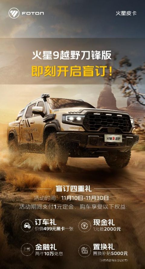 自11月10日起至11月30日,意向购车客户通过火星皮卡线下授权经销商店1元下订参与盲订,购车即享价值499元黑卡一张,1元抵 2000元购车优惠券,两年10万金融免息及置换补贴5000元四重豪礼。同时11月10日至11月12日锁定抖音福田营销工厂店直播间皮卡专场,线上留资,即可参与“越野人生 疯狂GO—购车抽送万元豪礼”线上直播活动。火星皮卡以卓越产品与极致权益,回馈每一位热爱越野、追求极致驾驶体验的尊贵客户,真正实现厂家与客户间的双向奔赴。