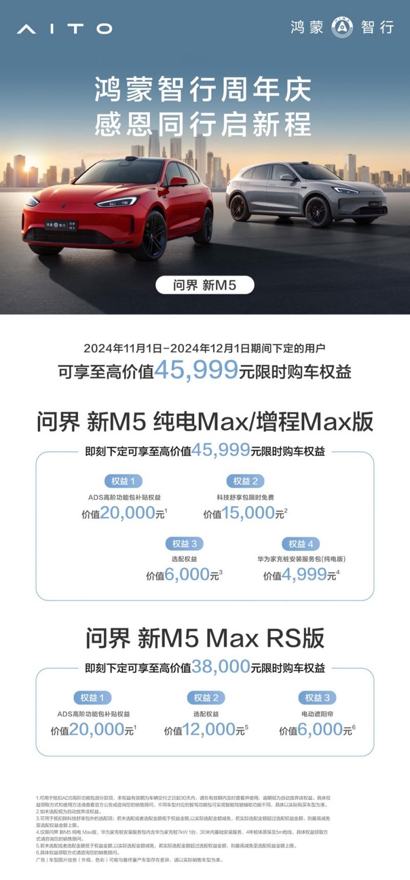 值此周年庆之际,鸿蒙智行推出了限时购车礼遇,包括限时购车礼、纯电发展礼、车主感恩礼、金融低息礼以及企业专属礼等多重购车福利。以问界M9为例,即刻下定五座版车型可享至高价值49999元的限时购车权益,包括ADS高阶功能包补贴权益、选配权益、电动踏板或后备箱定制储物箱等;而六座版车型则可享至高价值40000元的限时购车权益。