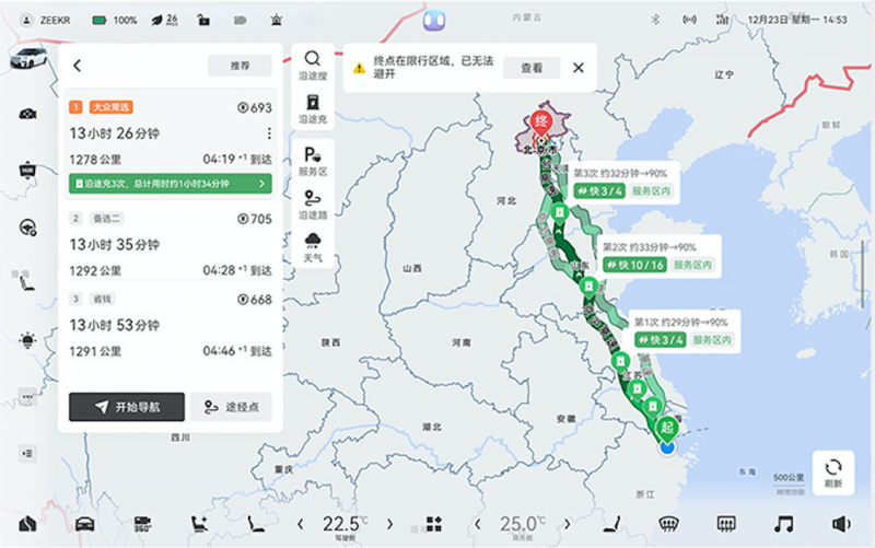 除此之外,极氪009 &极氪009光辉的ZEEKR OTA 6.3升级在导航功能方面进行了多项优化,让用户的出行体验更加便捷和安心。系统新增的异常天气提醒功能,在导航过程中实时监测前方的天气异常情况,提醒用户有效规避恶劣天气。自动加电路线规划功能同样值得关注,当电量无法到达目的地时,系统会智能规划充电路线,明确告知用户需要充几次电、在哪里充电,彻底告别里程焦虑,让用户的出行更加从容安心。