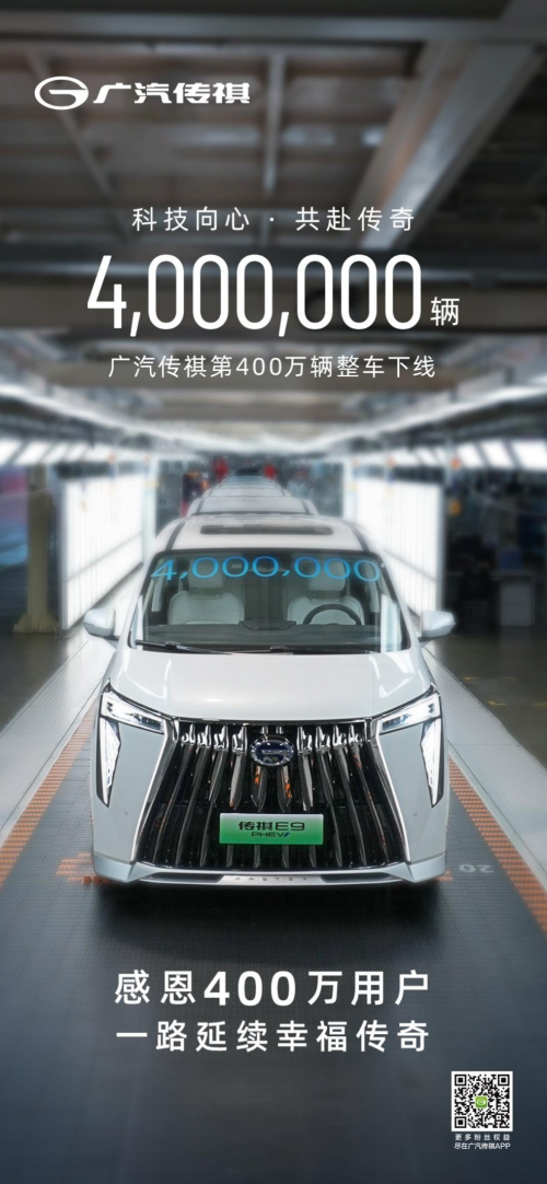 广汽传祺总经理黄永强在下线仪式上表示,“400万台的下线对传祺是一个全新的里程碑,标志着传祺向新能源科技公司转型、品牌向新向上取得重要成果,进入高质量发展新阶段”,从2010年第1辆传祺车的诞生到第400万辆整车下线,传祺凭借超越用户期待的高品质产品,获得了越来越多中国汽车消费者的认可。“2025年,传祺将坚持‘自研+华为’并进的技术路线,带来四款搭载高阶智驾功能的高端新能源车型”,以更加绿色、更加智能、更加科技的产品与服务,来回馈社会各界及广大用户的支持。