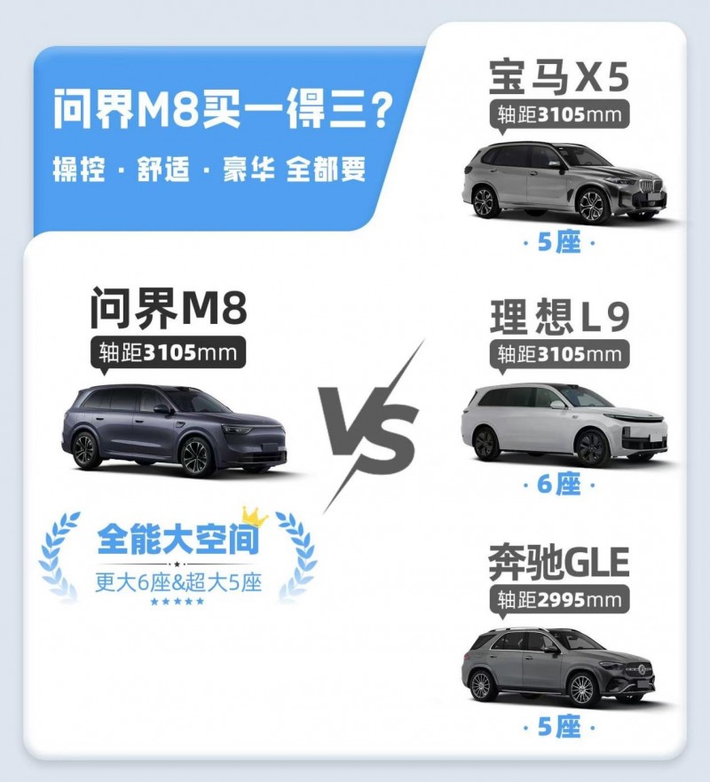 问界M8拥有5米2级车长,3105mm轴距,是标准的大尺寸SUV体量,尺寸和空间表现还要优于奔驰GLE和宝马X5。同时,问界M8提供尊享5座和奢享6座两种布局,相比只有6座版本的理想L9用户选择更多,两三口人小家庭选择五座版,大家庭可选择大六座。值得一提的是,问界M8采用前后不等宽轮胎,前轮265/45R21,后轮285/45R21,这样的配置开起来更稳、更舒适,而理想L9后轮也只有265/45R21,在并不醒目的产品细节上不计成本为用户考虑,这很问界。