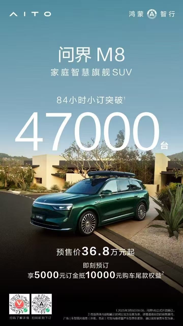 问界M8的4.7万的小订订单,不仅代表着消费者对这款产品的信任和青睐,更是市场对问界“智慧重塑豪华”理念的认可。当传统对手被迫迎战这场 “降维打击”时,中国新能源市场的竞争已进入深水区:唯有将核心技术转化为用户可感知的价值跃迁,才能在淘汰赛中赢得未来。而问界M8,正为行业书写着这份新规则的范本。