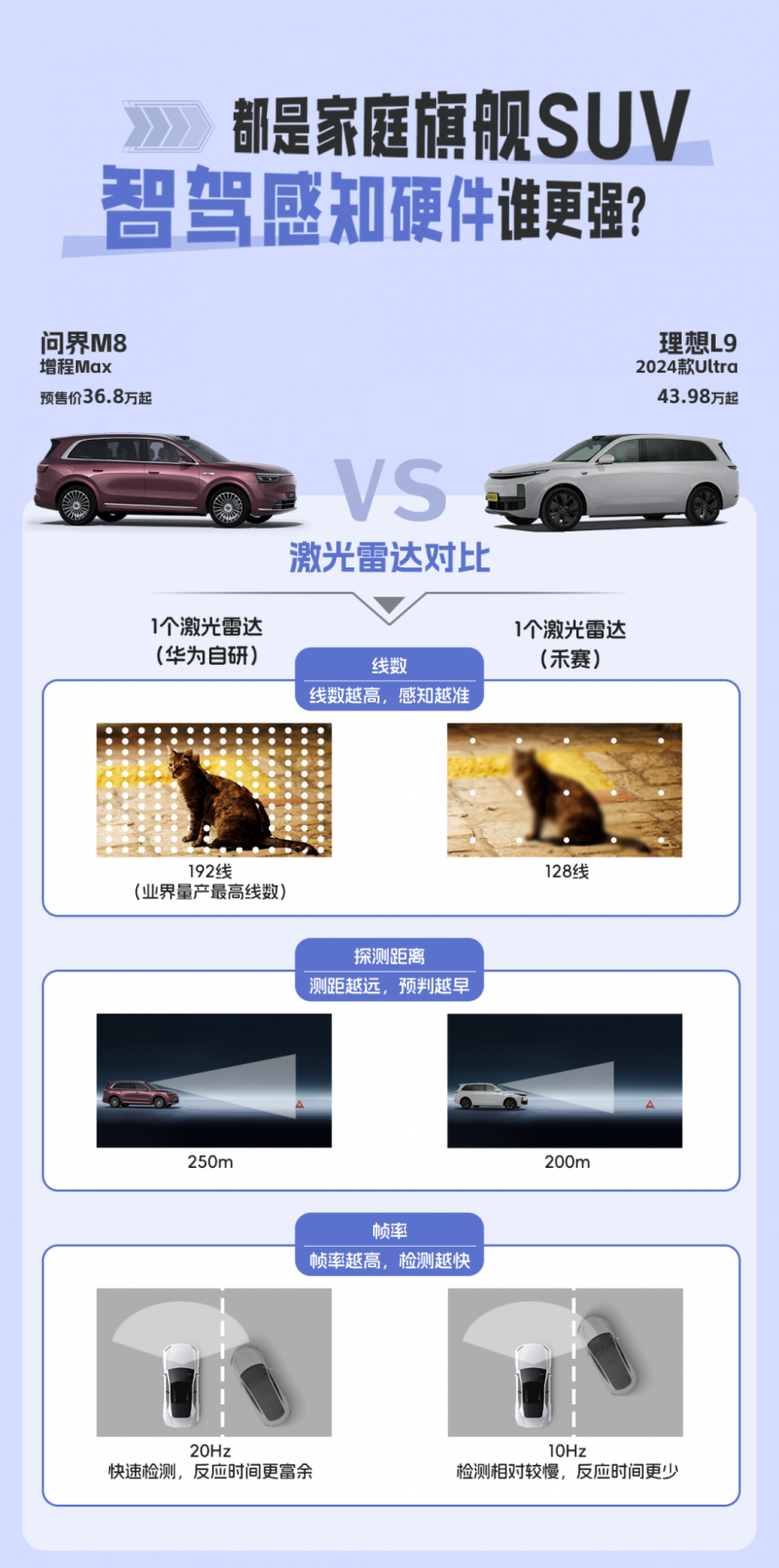此外,问界M8激光雷达 20Hz 的帧率(理想L9为 10Hz),使其能更快速追踪动态目标。例如在城市道路遇电动车突然穿插时,高频检测能力可让车辆更快识别并响应,减少突发场景下的事故概率。