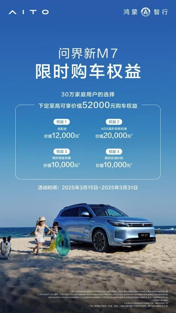 为了让更多家庭轻松拥抱智慧出行,问界官方近期又释放超值优惠。3月15日至3月31日,下定问界新M7至高可享价值52000元购车权益,包含选配金、ADS高阶包抵扣券、限时现金优惠等多项内容。计划买车换车的朋友,不妨前往线下门店试驾体验,亲身感受国民SUV问界新M7带来的独特魅力。