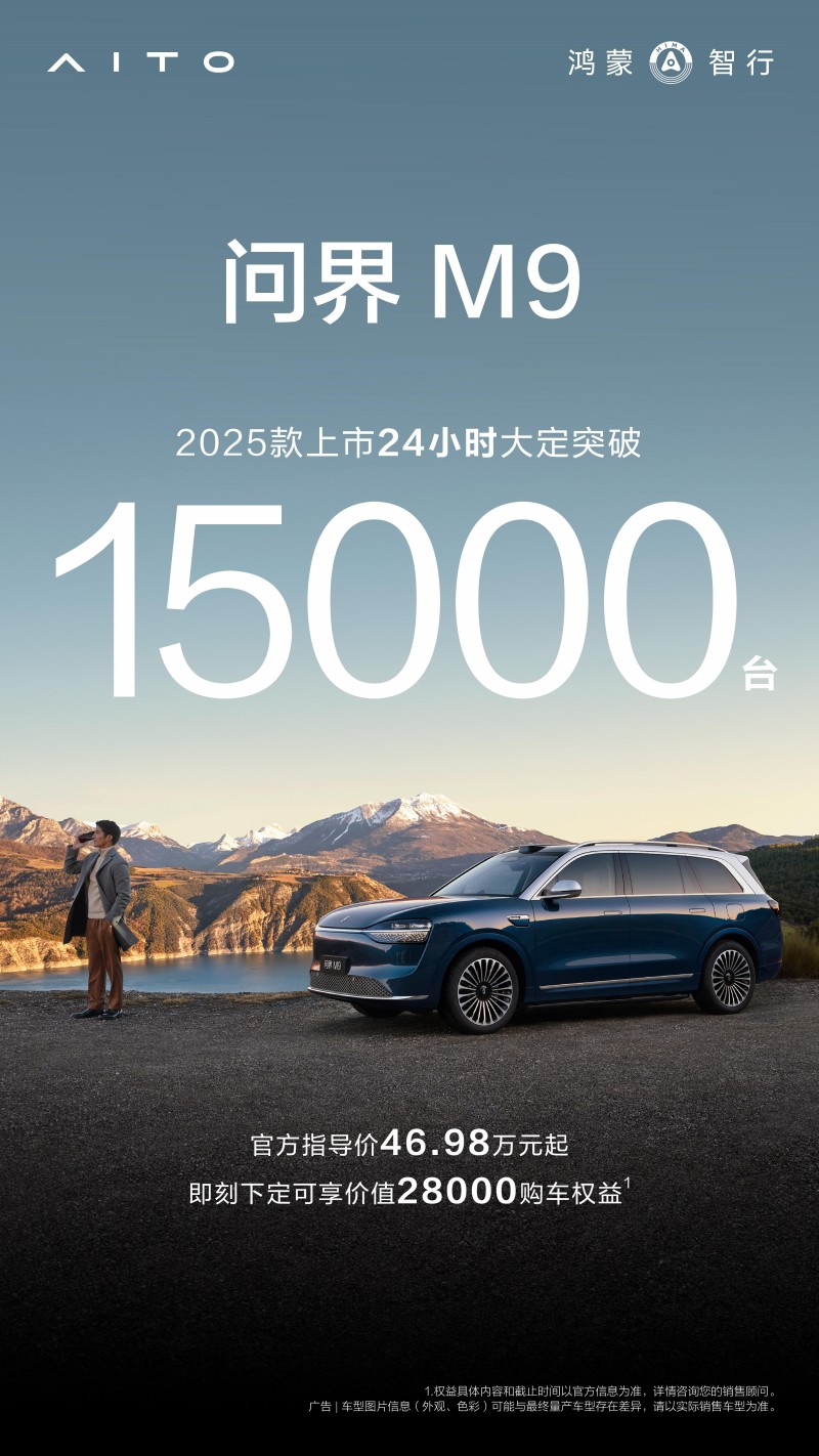 重塑豪华新高度,问界M9 2025款上市24小时大定突破15000台!