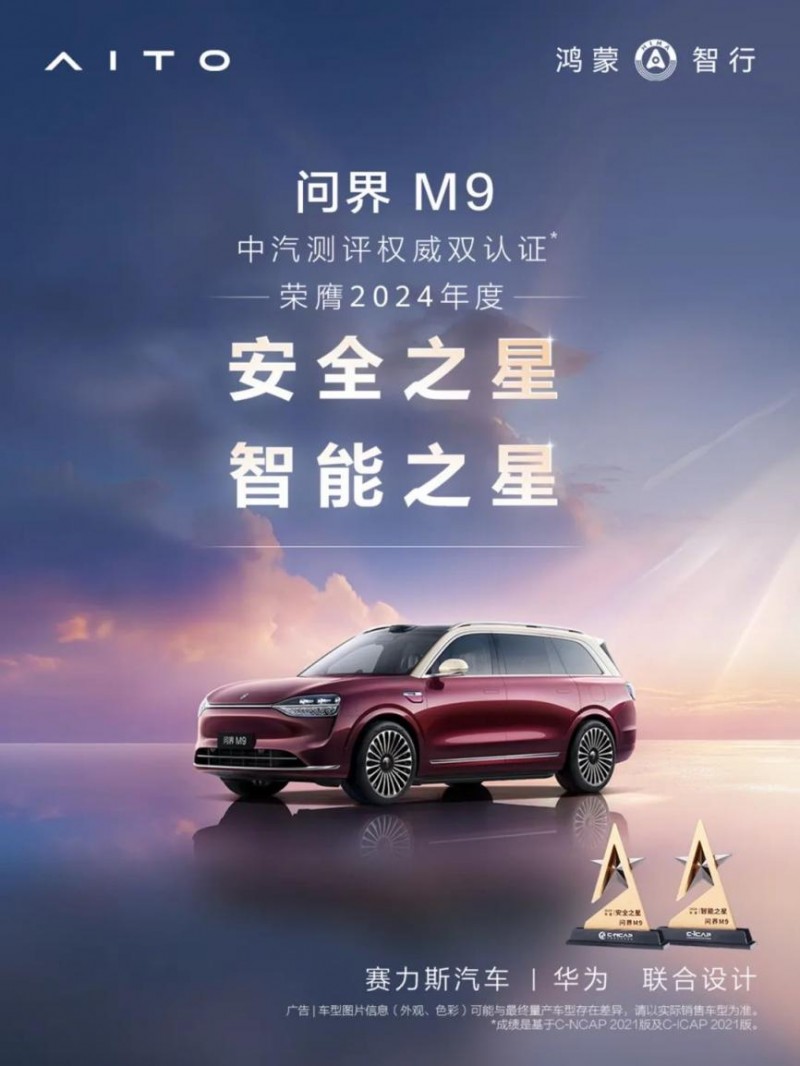 双星加冕,问界M9荣膺中汽测评“安全之星”、“智能之星”权威双认证
