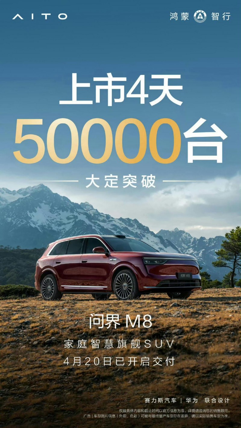 问界M8作为2024年鸿蒙智行旗下的重磅产品,从4月16日上市到今天首批交付仅仅用了4天时间,上市仅4天就突破了5万台。实现了“上市即热销,热销即交付”,刷新了行业新纪录,凸显了华为与赛力斯深度合作,在智能制造和供应链整合方面的强大实力,更代表了品牌责任感。也让更多持币观望的准车主看到了问界M8的诚意与实力。