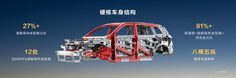 在被动安全方面,问界M8同样表现出色。车辆采用了高强度的车身结构设计,“八横五纵”笼式车身与高达81%的铝合金+高强度钢+热成型钢占比,为乘员提供了堪比“装甲车”的保护。全车共有12处采用2000MPa潜艇级热成型钢设计,占比超过27%,进一步提升了车身的抗冲击能力。此外,问界M8还配备了9个安全气囊和主动式安全带,能够在碰撞发生时为家人提供全方位的保护。