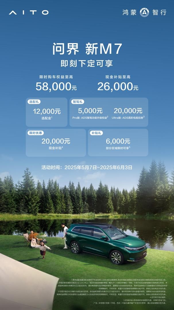 当前,官方还限时推出多重购车好礼,即刻下定问界新M7,您将有机会尊享至高价值58000元限时购车权益,现金补贴至高可享26000元。如果您正在寻找一款能满足家庭需求的豪华SUV,问界新M7绝对值得考虑!