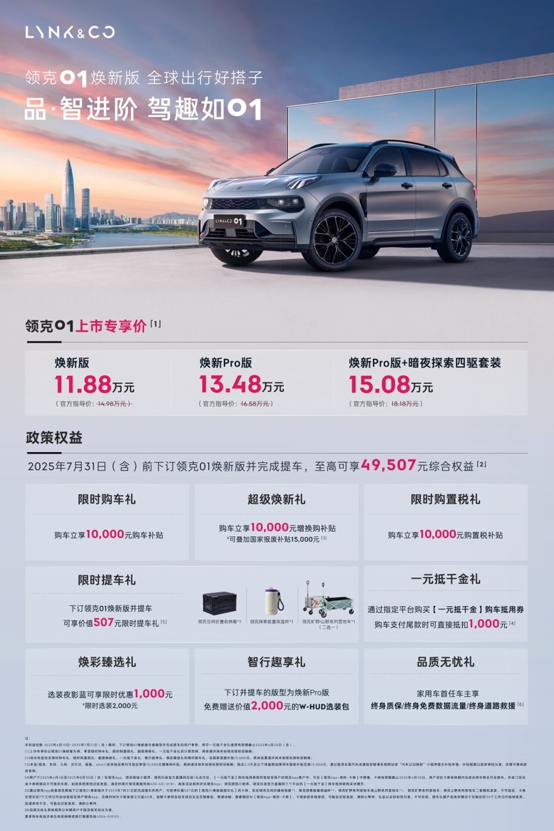 不仅产品实力进阶,领克01焕新版更以亲民价格叠加丰厚购车权益回馈用户支持。凡6月10日至7月31日(含)期间下订领克01焕新版任意版型并完成提车的用户,可享至高49,507元综合权益礼包,涵盖限时购车礼、限时购置税礼、超级焕新礼、一元抵千金礼、智行趣享礼、焕彩臻选礼、限时提车礼、品质无忧礼八大礼遇,覆盖用户购车、用车全生命周期。值得注意的是,一元抵千金礼使用有效期截止6月30日(含)。即刻下订,以超值价格开启焕新之旅。