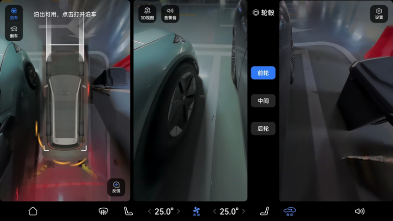 在低速场景下,新增前向碰撞预警(FCW)触发后激活全景影像。车辆低速起步时,前方及侧前一定范围内有碰撞风险的行人目标/障碍物,中控屏会拉起全景影像,并根据目标位置显示相应的视图,同时伴随音效提醒,起步更安心。
