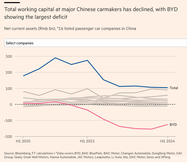 2024年底比亚迪的营运资本赤字扩大到了1254亿人民币,而吉利、蔚来、赛力斯、北汽和江淮的营运资本虽然也有赤字,但加起来只有178亿人民币。