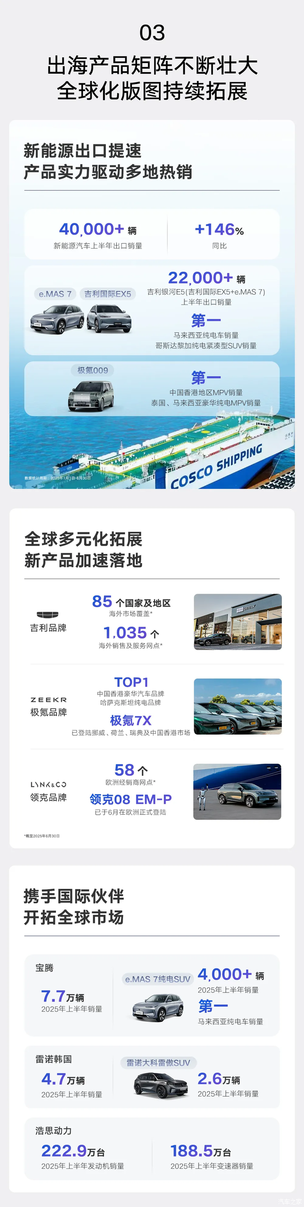 新产品方面,吉利银河M9将于第三季度上市,吉利银河星耀6将于第四季度上市;年内还会推出全新吉利帝豪和极氪9X;领克10 EM-P则将会在第三季度正式上市。出海方面,吉利品牌下半年进入巴西、英国、意大利、波兰和南非等多个国家市场,极氪、领克品牌下半年进入瑞士、丹麦和比利时等市场。