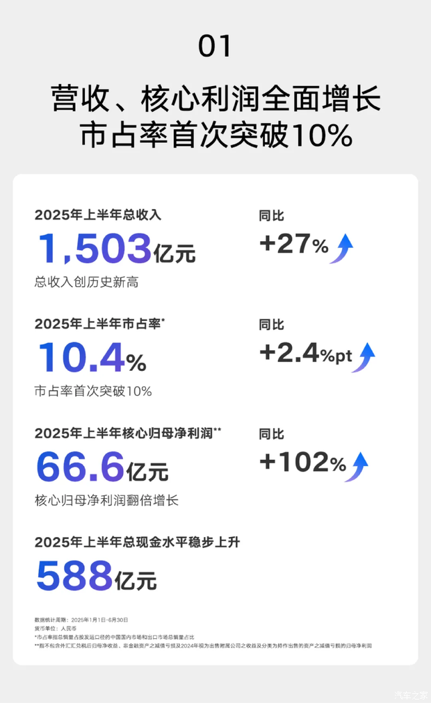 [本站 资讯] 8月14日,利汽车控股有限公司(简称“吉利汽车”)(0175.HK)正式发布2025年中期业绩,2025年上半年总收入1503亿元,同比增长27%,创历史新高;核心归母利润66.6亿元,同比增长102%;2025年上半年市占率10.4%,首次突破10%。此外,2025年全年销量目标上调至300万辆,提升11%。