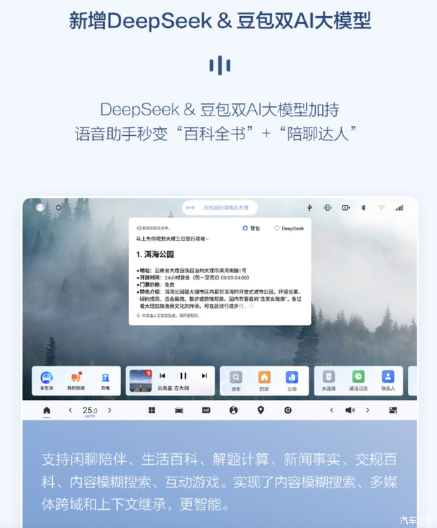 其中,新增的功能主要包括:DeepSeek & 豆包双AI大模型、爱奇艺APP、定制版咪咕快游、支付宝车生活APP等功能。