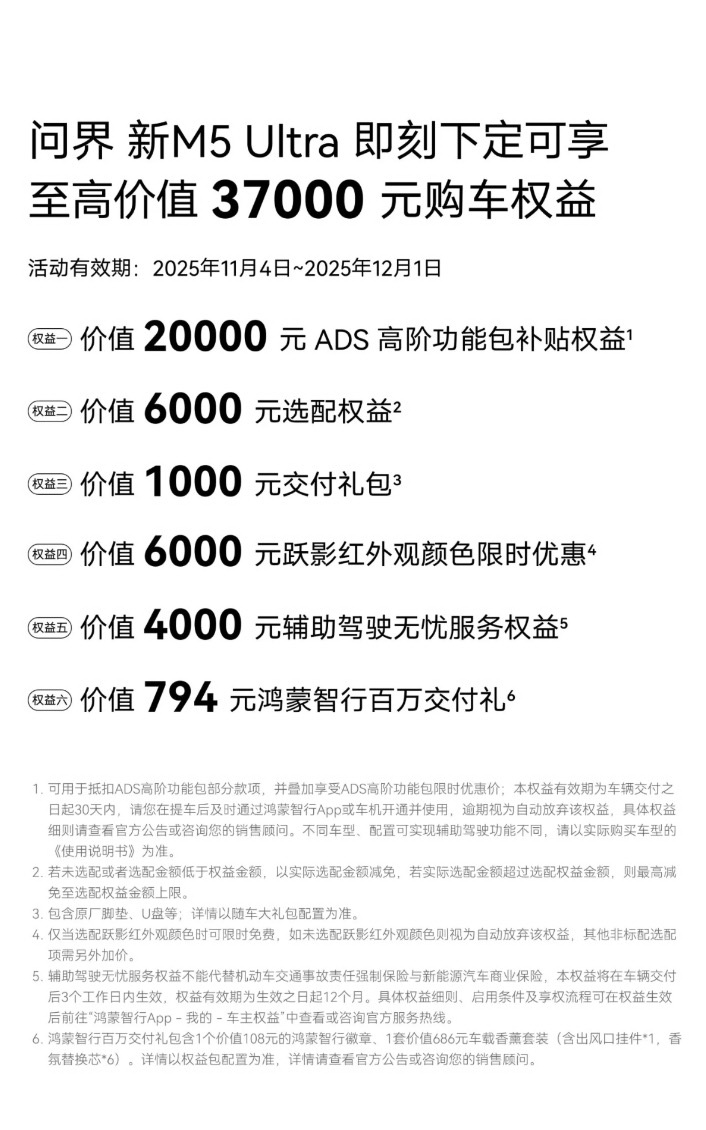 问界新M5 Ultra近期推出了颇具吸引力的购车权益包,总价值最高达37794元,包括:ADS高阶功能包补贴20000元;选配权益6000元;交付礼包1000元;辅助驾驶无忧服务权益4000元;跃影红车色限时优惠6000元等等。这些权益覆盖了功能升级、选配、售后等多个环节,实际降低了用户的购车与用车成本。