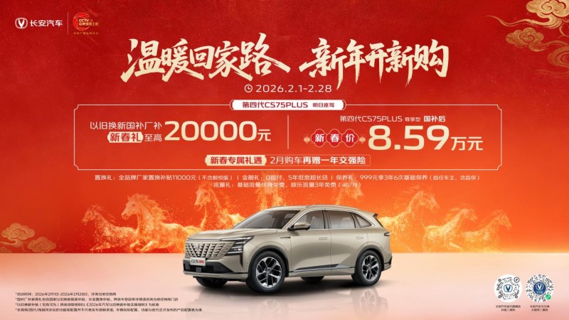 结语:新年首月长安CS75系列、逸动系列双双交出亮眼成绩,不仅延续了长安汽车2025年的强势表现,也为新一年的发展吹响了奋进号角。这份成绩的背后,是长安汽车在技术、产品、服务层面坚持长期主义、持续深耕的必然结果,也印证了其产品力获得越来越多用户的认可与信赖。眼下,长安汽车“温暖回家路,新年开新购”活动正火热进行中,至高2万元综合福利、赠交强险等多重优惠诚意满满。福利倒计时,试驾即享专属礼遇,如果您正计划购置新车,不妨就近前往当地长安门店深度体验试驾,提前解锁高品质出行生活!