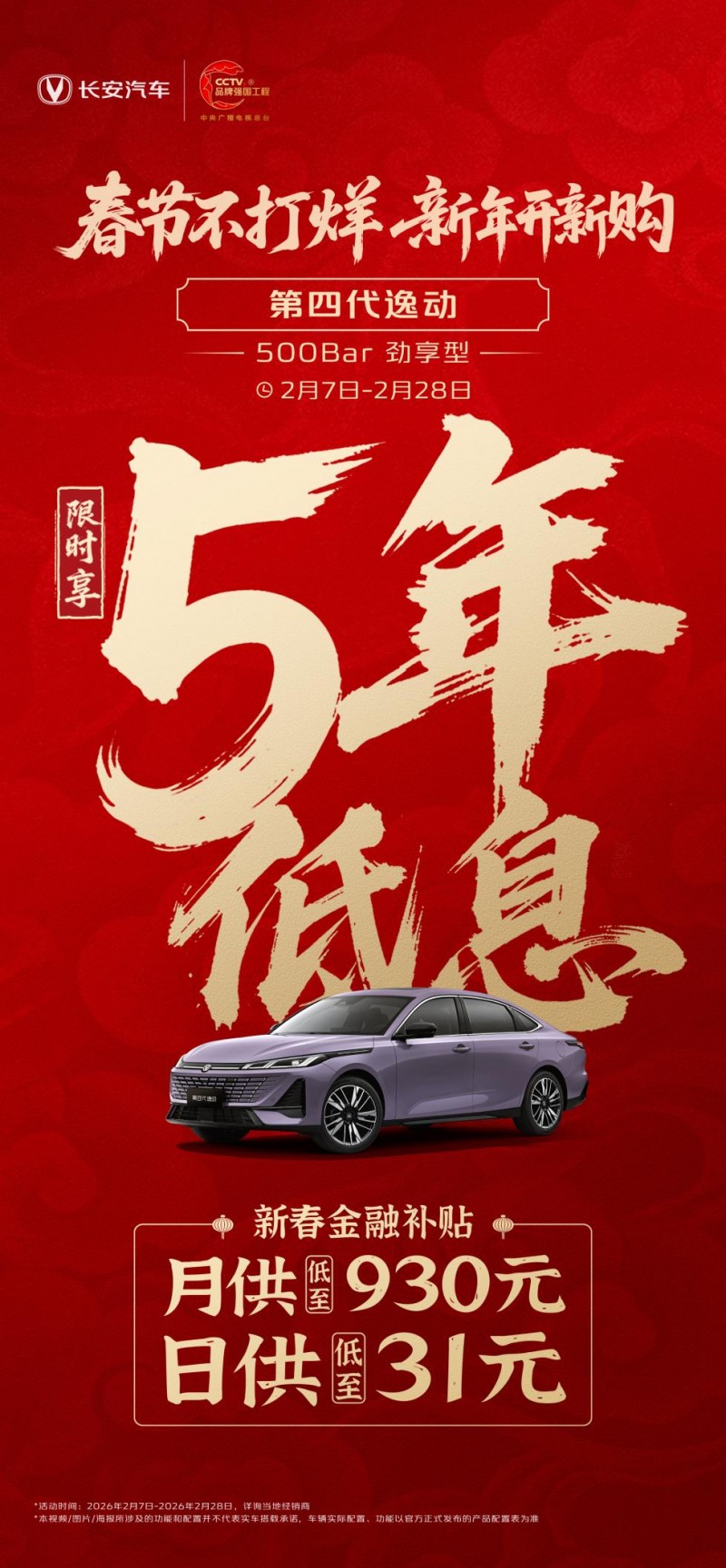 结语:逸动以长安汽车强大的体系赋能、对用户需求的深刻洞察,以及"全球智能家轿新标杆"的全面实力,持续巩固在自主燃油轿车领域的领军地位。新的一年,第四代逸动强势开局,正以更昂扬的姿态,陪伴更多中国家庭驶向美好生活。春节将近,即日起至2月28日,恰逢长安汽车“春节不打烊 新年开新购”活动正在推进,第四代逸动推出多重购车礼遇,500Bar劲享型限时享5年低息,新春金融补贴后月供低至930元、日供低至31元,让"开新车、过大年"的美好愿望触手可及。对于追求高价值体验的家庭而言,冠军之选,正当其时。