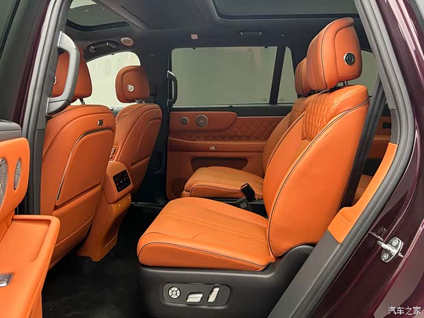 后排方面,该车采用2+2+2的6座布局,并配备车载冰箱、第二排可翻转娱乐屏等实用性配置,大大提升后排乘客的舒适度。同时,其翻折屏边缘加入氛围灯,有着不错的精致感。其他配置方面,该车前排提供手机无线充电,并在二排扶手处加入手机无线充电功能,满足不同乘客的需求。